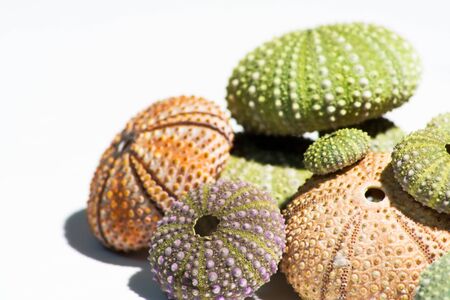 colorful sea urchins shells on white rock