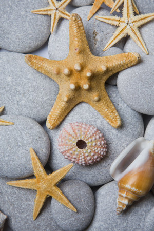 Nice background with starfish,seashells and a sea urchin