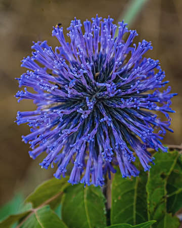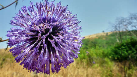 Purple flower in the garden, Thailand. (Echinops) Close-up of a flower in bloom in summer. Colorful, bright and bee-friendly in the gardens and fields of Bavaria.