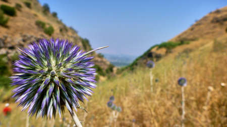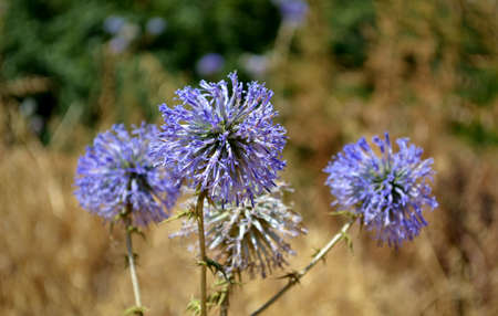 Blue southern globe thistle, Echinops flower close-up on a blurred background of yellow dry grass