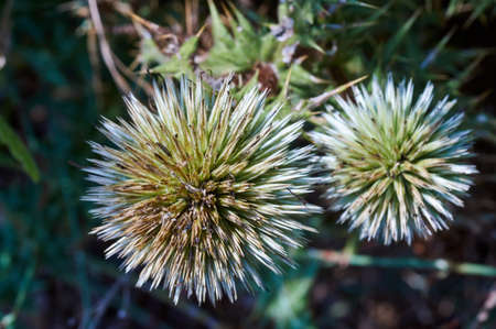 Close up selective focus of Great globe thistle, known as Echinops sphaerocephalus and Glandular globe thistle.