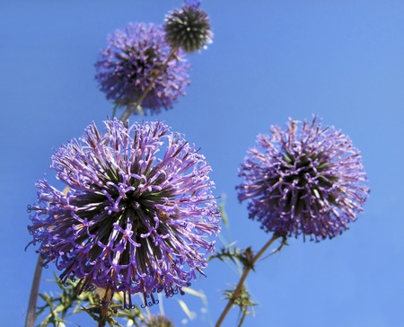 The blue globe thistle fully blooming in the summertime, the Netherlands, photo taken in frog perspective