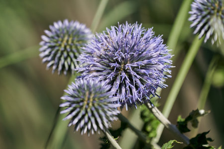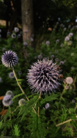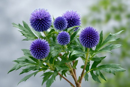 Purple globe thistle flowers blooming in a garden with green leaves and blurred background