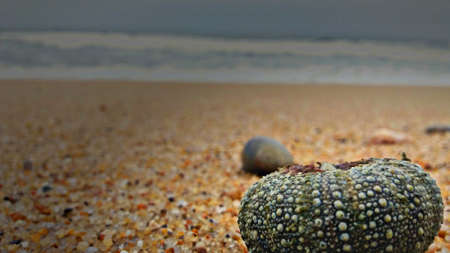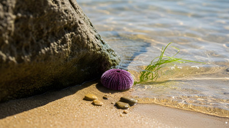 A close inspection reveals a sea urchin shell with intricate patterns and colors, resting on soft sand with the ocean waves gently lapping nearby, showingcasing nature's beauty.