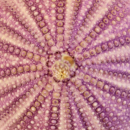 Sea urchin shell close up. Purple orange texture with a hole and spiny skin details.