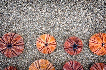 Detail of Violet colored Sea urchin shells on the wet sand. Close up of Disambiguation on the beach with black volcano sand. Background of purple Sea Urchin. Dried sea urchin on sand.