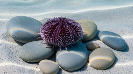 A vibrant purple sea urchin shell rests on smooth grey pebbles on a sandy bottom, dappled with underwater sunlight patterns. The image captures the textures of marine life and the serene atmosphere of the ocean floor.