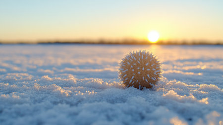 Close-up of a textured tan ball with spikes resting on glistening snow, sun low on horizon