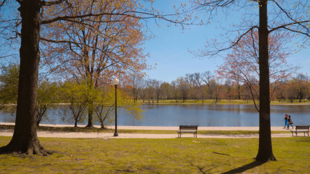 A lake, pond with calm water in a spring or summer botanical garden, park. Urban nature. Harmony and tranquility. Green trees in a parkland.