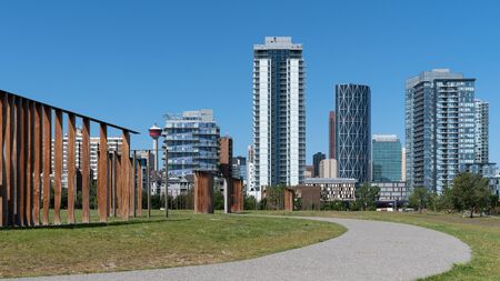 Panoramic image of the skyline of Calgary on a sunny day with blue sky, Alberta, Canada