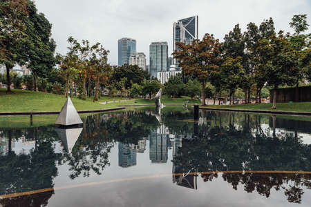 Cityscape that reflected on the pool near Petronas twin towers park's pool in Kuala Lumpur, Malaysia.
