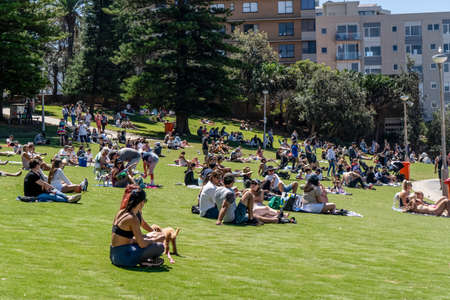 Cronulla, Australia 2021-10-17 People relaxing and sunbathing on a green grass near the ocean beach after end of 3 month lockdown in Sydney. Covid-19 Social distancing.