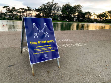 San Francisco, California March 23, 2020: Stay 6 feet apart social distancing guidelines for coronavirus COVID-19 in multiple languages and diagram in Golden Gate Park in San Francisco on lake bike path