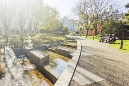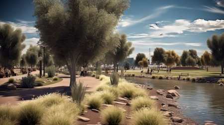 SERENAL AFTERNOON IN PARK People relax in the sun, Streams reflect tranquility., generative AI