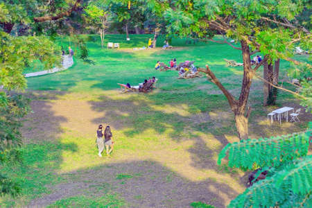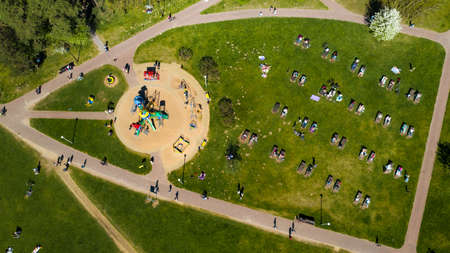 Top view of the many people are resting on the lawn in the park