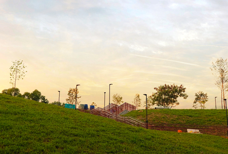 Outdoor staircase with metal railing in a park during sunset