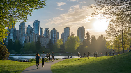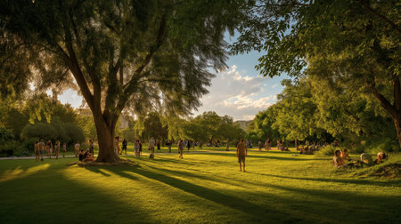 A peaceful park filled with people enjoying the outdoors under the golden sunlight, surrounded by lush green trees and open grassy space ideal for nature, lifestyle, recreation, and urban relaxation themes.
