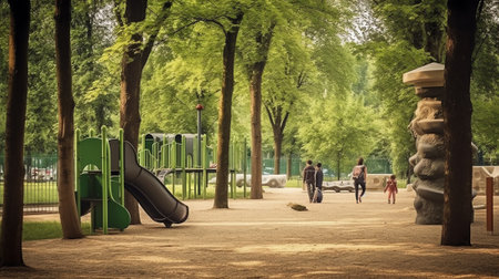 public park with childrens playground and nearby lake, surrounded by greenery, created with generative ai