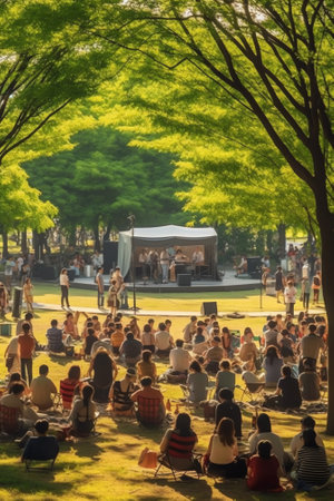 Serene singing in the park benches, shadow, community meditation., generative AI
