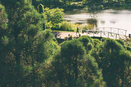 Morning runner on wooden foot bridge through lush garden greenery in a village on a sunny day. Young girl running by bridge over river with green trees background. Scenic photo with copy space