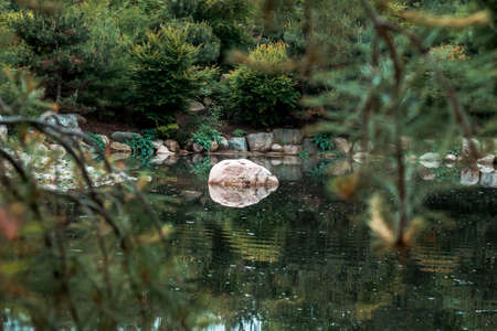 Mirror reflection of a stone on a lake in the japanese garden