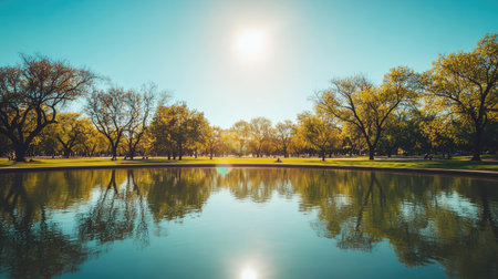 A serene park scene featuring a calm pond, surrounded by lush trees under a clear blue sky, providing a perfect getaway for relaxation and nature appreciation.