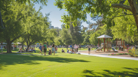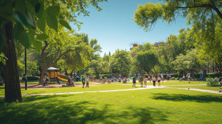 A group of people enjoying leisure activities in a park with a playground, surrounded by natural landscapes, trees, grass, and plants. AIG41