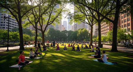 A group of diverse individuals are engaged in an outdoor yoga session on a sunny day in a vibrant city park, with lush green grass, tall trees, and urban architecture in the background.