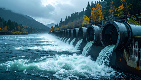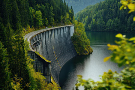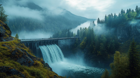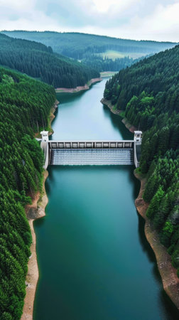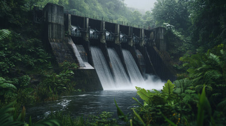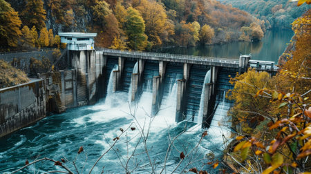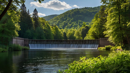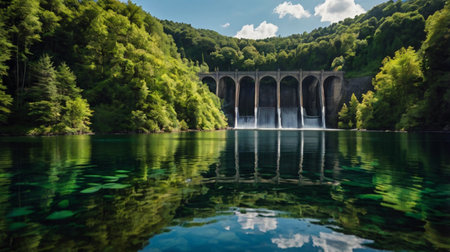 A hydroelectric dam nestled in a verdant landscape, water flows through the dam generating clean energy.