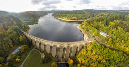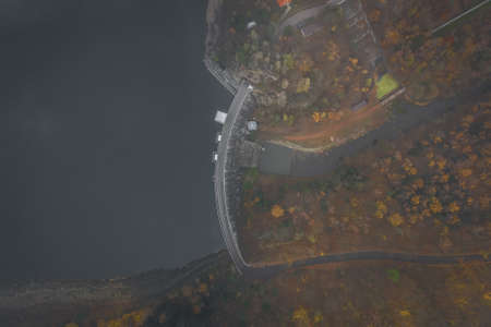 Aerial view of the dam on the lake in autumn forest.
