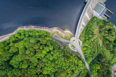 Drone shot of stone river dam at reservoir with flowing water, hydroelectricity power station in mountains. Water turbines are producing clean electricity at power plant in Pilchowice power plant.