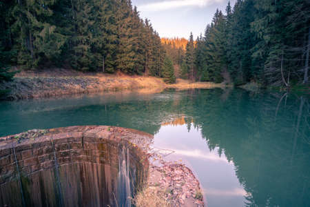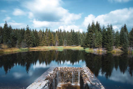 colorful lake in the middle of a spruce forest with a reflection on the water surface. Long exposure to a pond in the Jizera mountains in the north of central Europe. Rural nature.