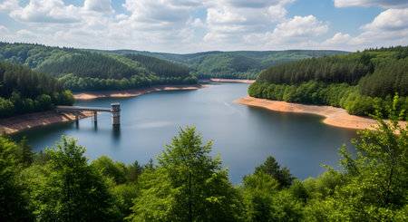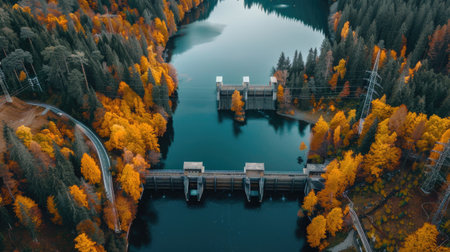 a hydroelectric power plant with a dam and water reservoir, surrounded by forests, created with generative ai
