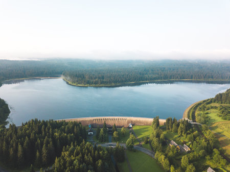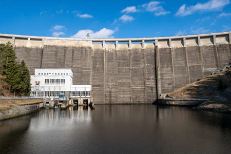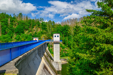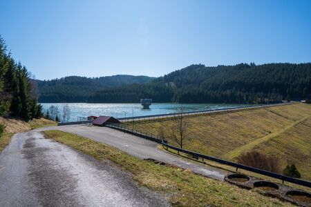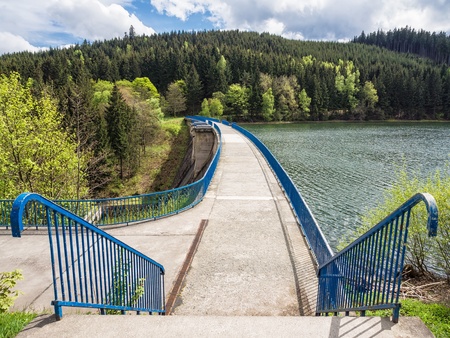 A view of the dam in Wippra in the Harz mountains with blue sky and sunshine.
