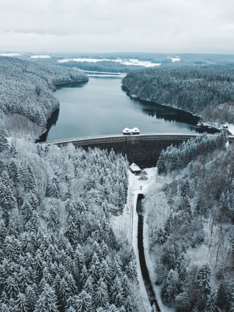 A big dam in the foreground and snow covered trees around.