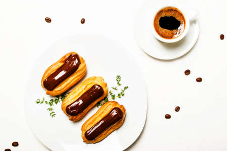 Eclairs cakes and morning espresso coffee in a cup, unhealthy breakfast, white background, top view