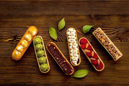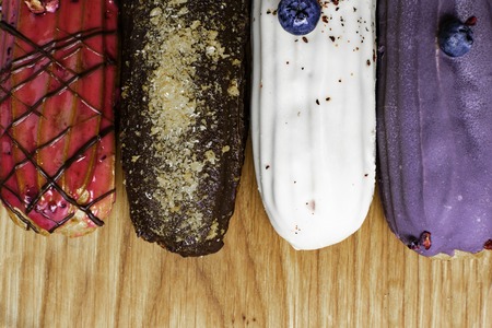 colorful group of delicious eclairs on wooden background copy space