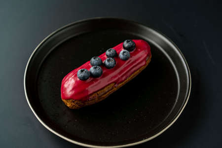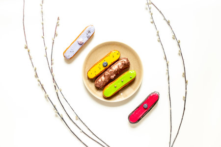 Plate of various glazed eclairs cakes. Sweet food background.