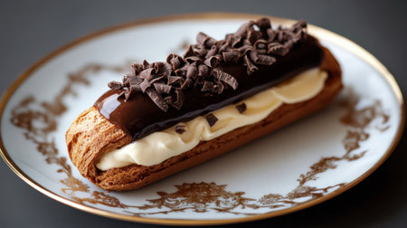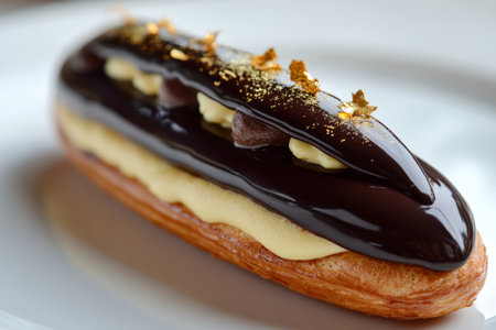 A close-up of a beautifully crafted éclair, filled with vanilla pastry cream and topped with a glossy chocolate glaze. The éclair is garnished with a delicate chocolate decoration and a sprinkle of gold leaf for a luxurious touch.