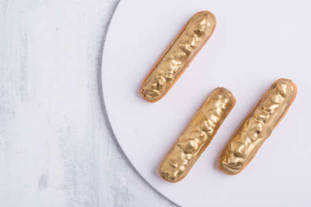 Group of Fench Delicious Dessert Eclairs in Plate. Traditional Dessert.