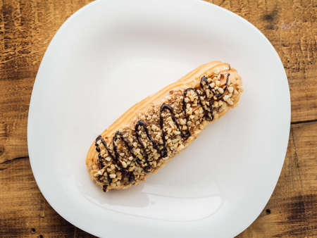 eclair on a white plate on wooden background. top view