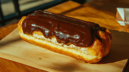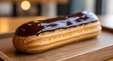 A delicious chocolate eclair sits on a wooden serving tray. The pastry is topped with shiny chocolate glaze and filled with cream, showcasing a classic French dessert in a bakery setting.