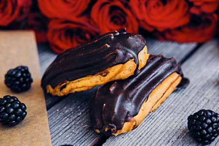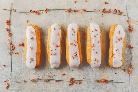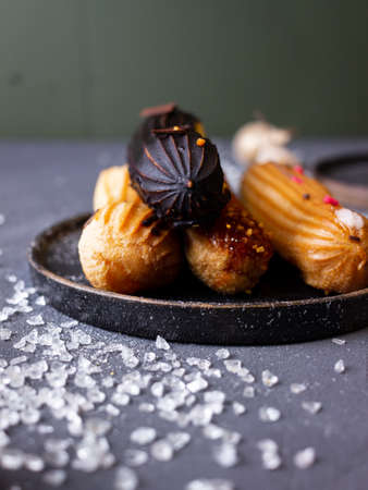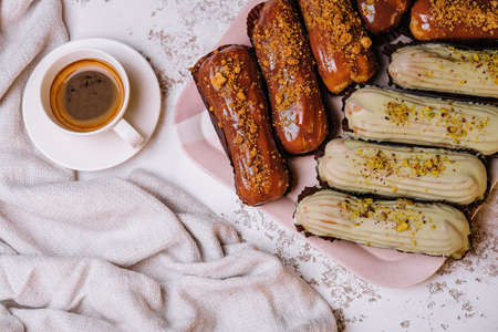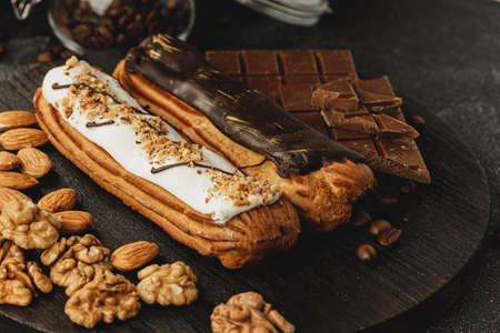 Home made cake eclairs. Traditional eclairs, profitroles classic, eclairs french.