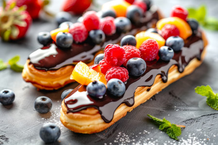 Fruit and Berry Eclair Cakes, Delicious Fruits Milk Dessert, Chocolate Mirror Glazed Eclairs, Copy Space, Generative AI Illustration