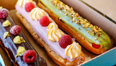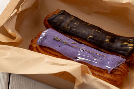 set of eclair cakes with different fillings in a box close up traditional french dessert