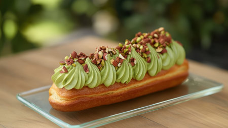 A beautifully presented green tea eclair adorned with chopped nuts on a glass plate. Ideal for showcasing culinary creativity and indulgent desserts.