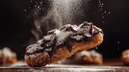 A beautifully crafted chocolate eclair dusted with powdered sugar, showcasing its rich texture and elegant design. Perfect for dessert lovers!