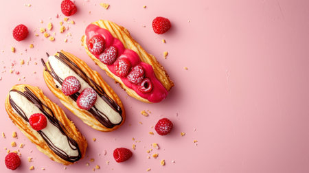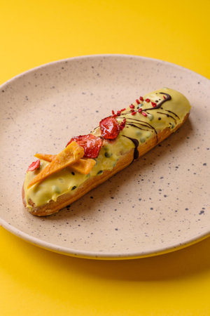Eclairs with pistachio raspberries and chocolate cream topping