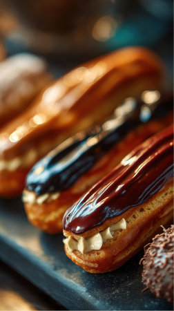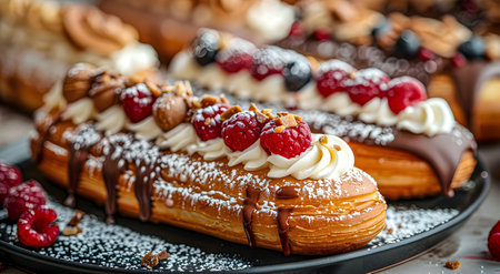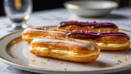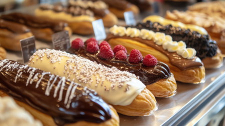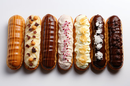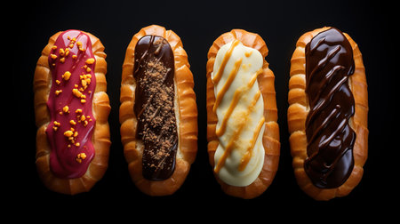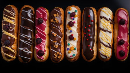 eclairs with various fillings lined up elegantly, created with generative ai