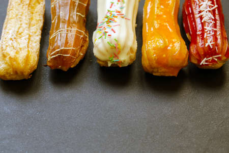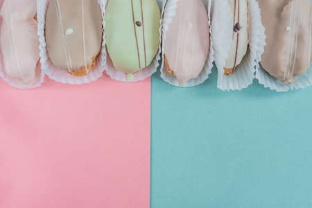 French food, dessert eclair with chocolate filling and covered with colored icing. Sweet eclair as a background for your design